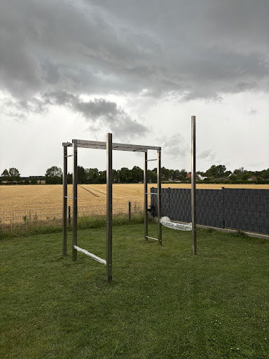 Eine Station speziell für Outdoor Crosstraining: Drei Klimmzugstangen, Dip-Barren, Sprossenleiter, Monkey-Bar, Human-Flag Stange, Kletternetz und eine Langhantelhalterung (als Zubehör erhältlich)
