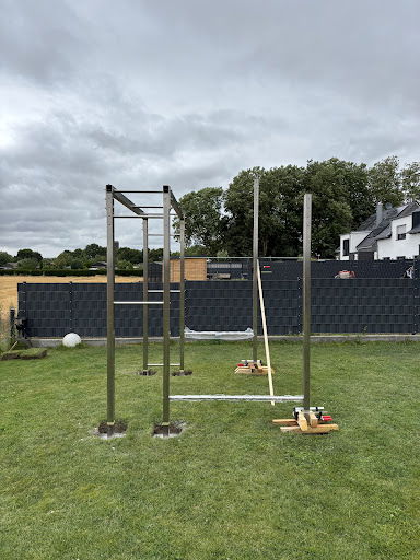 Die parallele, lotrechte und fluchtende Ausrichtung der Pfosten zueinander ist für eine stabile Aufstellung der Anlage von großer Bedeutung. Mittels der mitgelieferten Gewindestangen in Größe M12 und den Turnstangen kann die Station vor dem Betonieren bereits exakt ausgerichtet werden. Somit wird der Abstand der Pfosten millimetergenau bis zum Aushärten des Betons sichergestellt.